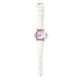 Eine Uhr mit schönem Hintergrund. Ein rosa pastellfarbener Himmel mit flauschigen Wolken und einem Zitronenbogen. Magisches und skurriles Design.