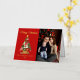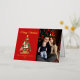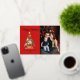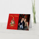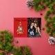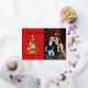 Elegante Urlaubskarte mit einem festlichen Weihnachtsbaum, geschmückt mit Ornamenten und umgeben von Geschenken. Personalisieren Sie die Vorderseite der Karte, indem Sie einen individuellen Gruß, Ihren Familiennamen und das Jahr in Echtgoldfolie mit Ihrem vertikalen Foto schreiben. Fügen Sie Ihre benutzerdefinierte Nachricht in die Innenseite der Karte hinzu oder verließ sie leer, um Ihre eigene zu schreiben. Die Rückseite der Weihnachtsbaum-Weihnachtskarte aus Gold kehrt auf einen dunkelroten Hintergrund zurück