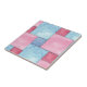 Eine attraktive Kachel, die als Trivet verwendet werden kann, mit einem Patchwork in rosa und blauen Denim-Farben, aus einem handgemalten Aquarellbild von Judy Adamson.