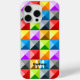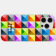 Patchwork Farbiges geometrisches Muster Monogram iPhone 15 Case. Personalisieren Sie einzigartige lustige Geschenke mit Ihrem ersten und Namen. Viele Dreiecke in Gelb, Orange, Rot, Rosa, Blau, Grün, die moderne geometrische Muster schaffen.