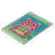 Die mehrfarbige, niedliche Polka-Dot-Patchwork-Eule stand auf einem blühenden Baumzweig mit verziertem blauen Hintergrund und grünen Polka-Punktgrenzen.