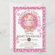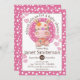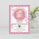 Niedliches Flickwerk Hippo Baby Dusche Einladungen mit weißen auf rosa Polka Punkte und rosa gestreiften Herzen.