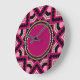 Geometrisches Patchwork-Kunstmuster in Rosa und Schwarz. Passend zwischen heiß rosa Mittelkreis und goldenen Punkttrims, um die Uhrenhand zu erhöhen, und auch perfekt Platz für Sie, um mit Text zu personalisieren, wenn Sie möchten.