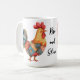Niedlicher Hähnchenkaffee, der perfekt für Morgenmensch ist und mit Ihrem Slogan oder dem Standardtext "Rise and Shine" personalisiert ist, wird in einem farbenfrohen Patchwork gemustert gestaltet. Also andere koordinierende Küchenartikel in derselben Sammlung.