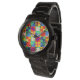 Diese Frauenuhr hat ein Bauhaus-Design von Quadraten mit seltsamen Formen innen, wiederholt über das Design.