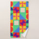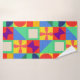 Dieses Set ist mit einem goldenen Waschlappen, einem orangefarbenen Handtuch und einem Badetuch ausgestattet, das sich in einem Bauhaus-Design aus quadratischen Quadraten mit ungewöhnlichen Formen im Inneren wiederholt.