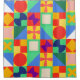 Dieser Duschvorhang hat ein Bauhaus-Design von Quadraten mit merkwürdigen Formen innen, wiederholt über das Design.