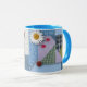 Diese Imitat-Steppdecken-Tasse kennzeichnet einen Einklebebuchblick mit einem Patchworksteppdeckenquadrat, Knöpfen und einem Gänseblümchen. Eine große Geschenkidee für ein quilter oder eine Näherin!