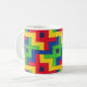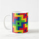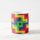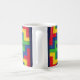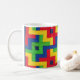 Eine Tasse des weißen Kaffees mit einem bunten, abstrakten Entwurf von einer Patchwork Feldbettsteppdecke durch Judy Adamson.