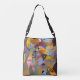 Dieses farbenprächtige Patchwork-Design auf einer Tasche wird sicherlich Aufmerksamkeit erregen. Es besteht aus vielen Stoffmustern, die mit kleinen bemalten Bildern verziert sind.