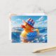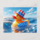 Eine lebendige gelbe Gummiente mit einem Hut mit amerikanischem Fahnenmuster schweben auf dem glitzernden blauen Wasser eines Ozeans Alle Texte können bearbeitet werden.
