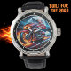 This striking watch face features a chrome cruiser motorcycle with red and blue accents, speeding along a road. Behind it, a large American flag waves prominently against a vibrant sunset and moonlit sky, casting reflections on the wet surface. The scene is framed by abstract, fiery-orange and red streaks at the bottom, conveying intense motion.