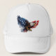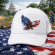 A striking side-profile illustration of a bald eagle mid-motion. With wings fully outstretched, the eagle surges forward in a commanding pose, its sharp golden eye, hooked yellow beak, and extended talons conveying strength, vigilance, and resolve. One wing is rendered in deep navy blue adorned with crisp white stars, while the other flows in bold red and white stripes, transforming the wings into a living embodiment of the American flag. Dynamic paint splashes and dripping accents in red, white, and blue radiate from the feathers, adding a modern, high-impact energy.