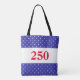 In celebration of the USA's 250th anniversary, 250 appear in red letters. Can be customized with desired text. A blue background with white stars is above and below a white stripe.