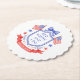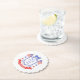 This patriotic bridal shower coaster design features a watercolor crest with a light red white and blue patriotic crest with American flags and a blue bow. Text in the center of the crest says "Red, white and I do." You can personalize with your event date.