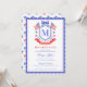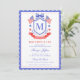 This patriotic bridal shower invitation features a watercolor crest with a light red white and blue patriotic crest with American flags and a blue bow. There is a cute scalloped blue border around the edge. You can personalize with your monogram.