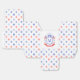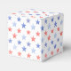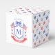 This patriotic bridal shower favor box design features a watercolor crest with a light red white and blue patriotic crest with American flags and a blue bow. The sides have a red and white stars pattern. You can personalize with your monogram and name.