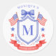 This patriotic bridal shower sticker design features a watercolor crest with a light red white and blue patriotic crest with American flags and a blue bow. You can personalize with your monogram and name.