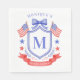 This patriotic bridal shower napkin design features a watercolor crest with a light red white and blue patriotic crest with American flags and a blue bow. You can personalize with your monogram and name.