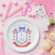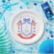 This patriotic wedding paper plate design features a watercolor crest with a light red white and blue patriotic crest with American flags and a blue bow. You can personalize with your monogram, wedding date and names.