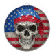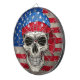 Der Patriotische Schädel trägt eine Bandanna in lebhaften Rot-, Weiß- und Blautönen, Set vor der amerikanischen Flagge, die den amerikanischen Geist symbolisiert.