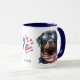 Das Merkmal dieser einzigartigen Tasse ist ein Aquarellbild eines Rottweiler-Hundes, der in einer amerikanischen Flagge verpackt ist und eine Sonnenbrille trägt. Das Bild befindet sich auf zwei Seiten der Tasse, mit einem US Flagge-Pfotendruck und einem benutzerdefinierten Text dazwischen.
