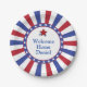 Ein patriotisches Design mit rot-weiß-blauen Sonnenburststreifen und Sternenkreis. Personalisieren Sie Ihre Informationen, indem Sie den Beispieltext in der Entwurfsvorlage ersetzen. Es gibt viele Einsatzmöglichkeiten für dieses Party-Platte, darunter Zuhause-Party für Militärmitglieder, Wiedersehen, Party vom 4. Juli, Geburtstage und vieles mehr.