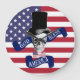 Fantastisch patriotisches amerikanisches Flaggendesign mit einem lustigen Vintagen gotischen Schädel mit Abraham Lincoln-Deckhut und einer rot-weiß-blau-US Flagge-amerikanischen Sternenfahne mit gottesfreundlichem Amerika-Sprichwort.