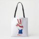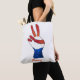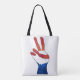 Dieses patriotische Handgemälde zeigt das Zeichen der Ruhe in den Farben Rot, Weiß und Blau. Das Wort "Friede" wird unter der Hand in roten Buchstaben auf der Vorderseite der Tasche geschrieben. Auf der Rückseite der Tasche ist ein größeres Friedenszeichen angebracht. Der Text kann auf dem Vorlagenformular leicht angepasst werden. Die Finger sind rot, die Handfläche weiß und das Handgelenk blau. Das ist ein großartiges Design für den Gedenktag, den 4. Juli, und für die Wahlveranstaltungen.