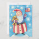 Einfach die Weihnachtszeit-Party Einladung anpassen. Vintage Illustration niedlich Frohe Weihnachtsgestaltung mit einem bezaubernden, fröhlichen, patriotischen Weihnachtsmann mit rot, weiß und blau Kleidung und einer amerikanischen Flagge und einem Teddybär. Die Sterne leuchten hell am Nachthimmel und sehen aus wie Schneeflocken im Winter. Weltfrieden. Ein tolles Bild für die Weihnachtsferien oder für den 4. Juli!