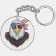 Ein gewagter, doppelseitiger Schlüsselanhänger mit einem kahlen Adler, der eine Aviator-Sonnenbrille trägt, und einer Bandana mit amerikanischer Flagge. Das perfekte Emblem des Patriotismus und des amerikanischen Stolzes, ideal für Schlüsselanhänger oder andere Accessoires, die ein starkes Zeichen von Freiheit und Stil zeigen.