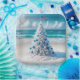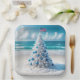 Ein weißer Weihnachtsbaum mit blauen und silbernen Verzierungen steht an einem Sandstrand, der mit einer amerikanischen Flagge überragt ist