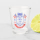 Diese patriotischen Brautdusche Shotgläser haben ein Wasserfarben-Wappen mit einem hellroten, weißen und blauen patriotischen Wappen mit amerikanischen Flaggen und einer blauen Schleife. Der Text in der Mitte des Wappens lautet "Rot, weiß und ich heirate". Sie können mit Ihrem Ereignisdatum personalisieren.