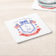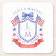 Dieses patriotische Hochzeit-untersetzer-design zeigt ein Wasserfarben-wappen mit einem hellroten weißen und blauen patriotischen Wappen mit amerikanischen Flaggen und einer blauen Schleife. Sie können mit Ihrem Monogramm, Hochzeitsdatum und Namen personalisieren.