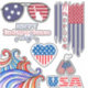 Sieben verschiedene Illustrationen mit patriotischen Independence Day-Texten und Bildern in Rot-Weiß und Blau, darunter Aviatorbrillen im Biden-Stil, eine vertikale Flagge, Hundetags, Herz und Wirbel