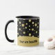 Das Design ist eine schicke Tasse für Modebewusste und zeichnet sich durch ein goldenes Polka Dotmuster auf einem kontrastierenden schwarzen Hintergrund aus. Einfach den Beispieltext mit dem Text oder Namen auf der anderen Seite bearbeiten.