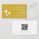 QR-Code Pet Sitter Gold Visitenkarte, mit einem Pfotendruck-Design und weiß-schwarz Typografie. Mit anpassbarem Text können Sie Ihre eigenen Informationen hinzufügen. Die Rückseite hat einen QR-Code, in dem Sie Ihre Website hinzufügen. Ideal, um eine berufliche Touch für Ihr Heimtierdienstgeschäft hinzuzufügen.