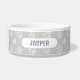Pawsome Paw Prints Heart Pattern Hund oder Katzenschale in grauen Schattierungen mit einem Namensschild, für den niedlichen Furry Buddy. Wählen Sie die Größe aus und personalisieren Sie den Text einfach. Kate Eden Art