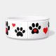 Zeigen Sie Ihrem Hündchen Ihre Liebe mit dieser kundenspezifischen Hundeschüssel! Schwarze Tatzendrucke der Ausrüstungsbeschreibungen und rote Herzen!