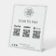 Optimieren Sie Ihr Kasse-Erlebnis mit diesem schlanken Multi-Payment-QR-Zeichen, das für moderne Unternehmen konzipiert wurde, die Klarheit und saubere Ästhetik schätzen. Dieses freistehende Podestschild mit den Logos PayPal, Venmo und Cash App in klassischem Schwarz schafft eine einheitliche und berufliche Verkaufsanzeige. Ganz oben steht der Begriff "SCAN TO PAY" in einem knackigen, leicht lesbaren serifenlosen Schriftart, der eine schnelle Kundenerkennung gewährleistet. Drei QR-Codes liegen deutlich darunter und sind mit minimalistischen schwarzen Markenikonen versehen. Ideal für nahtlose Zahlungen an Lieferantentischen, Märkten, Cafés und Salons. Eine individuell anpassbare Fußzeile bietet Platz für Ihre Website und soziale Griffe und hilft Ihnen dabei, Markenkonsistenz über alle Touchpoints hinweg zu schaffen. Dieses Schild ist vollständig editierbar: Hochladen Sie Ihre eigenen QR-Codes, passen Sie die Schriftart oder Hintergrundfarbe an und personalisieren Sie es mit Ihrem Logo. Sein neutrales Design passt mühelos in jede Markenästhetik, vom modernen Minimalismus bis hin zum rustikalen Chic. Funktionell, elegant und benutzerfreundlich vereinfacht dieses QR-Codezeichen den Zahlungsvorgang und steigert die Kundenerfahrung.