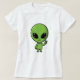 A cute green alien stands cheerfully against a deep black background, flashing a friendly peace sign. Its oversized head, smooth round shape, and large glossy black eyes give it a playful, approachable personality. Subtle highlights and clean outlines create a polished cartoon look, while the simple pose and bright green color make the character feel lighthearted and fun. The overall illustration blends sci‑fi charm with adorable kawaii style.