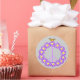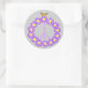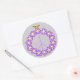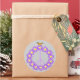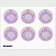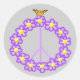 Ein Kunstwerk aus violetten Blumen, das zu einem Friedenszeichen gemacht wurde, mit einem orangefarbenen Schmetterling, der oben sitzt und auf Stickern angezeigt wird.