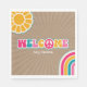 Groovy Babydusche Thema mit einem in "Welcome" Text integrierten Friedenszeichen mit eigenem Namenstext. Sonnenschein oben verlassen und Regenbogen rechts über dem Kardinal inspiriert Sonnenbrunnen.