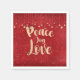 Peace Joy and Liebe Gold Schild mit Sternen und Schneeflocken auf rotem Hintergrund.