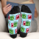 Peace Liebe Hippos Socken. Ein Friedenszeichen, ein Herz und ein niedliches Nilpferd-Muster auf coolen blauen Socken.