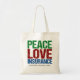 Eine niedliche, individuell anpassbare Agent-Tote-Tasche mit grünen, roten und blauen Buchstaben, die Peace Liebe Insurance lesen. Großartiges personalisiertes Geschenk für Ihre Mitarbeiter in der Versicherungsgesellschaft.