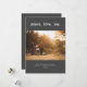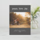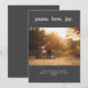 Frieden. Liebe. Joy Simple Minimal Foto Template Holiday Card. Text, der mit Ihren Wunschnamen und Datum angepasst werden kann. Fotovorlage bereit. Dunkelgrauer Hintergrund. Farben können an Ihr Foto angepasst werden.