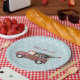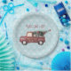 Papier Teller mit einem Bild eines niedlichen kleinen Spielzeugwagens mit Frohe Weihnachtshand gemalt auf der Seite. Tragen Sie einen verzierten Weihnachtsbaum im Hintergrund. Im Text steht: Peace Liebe & Joy. Set auf einem blauen und weißen Schneeflockenmuster.