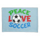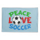 Niedliches Fußball Weihnachtsgeschenk mit den Worten PEACE LIEBE SOCCER in Rot, Grün und Blau auf einem cool blauen Sporthintergrund.