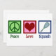 Peace Liebe Squash Weihnachtskarte für einen Sportspieler mit einem Friedenszeichen, Herz und Schläger. Niedliche Sportkarten für einen Squash-Spieler.